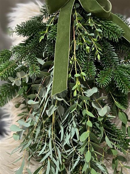 Fresh greenery, including pine, fir, and eucalyptus stems, giving it a lush and textured appearance. The arrangement is tied at the top with a wide, luxurious velvet ribbon.